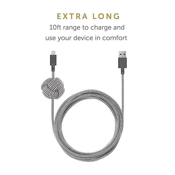 - EXTRA LONG: 10-foot range lets you use and charge your device in comfort, while the weighted knot anchors your cable to any flat surface when detached from your device