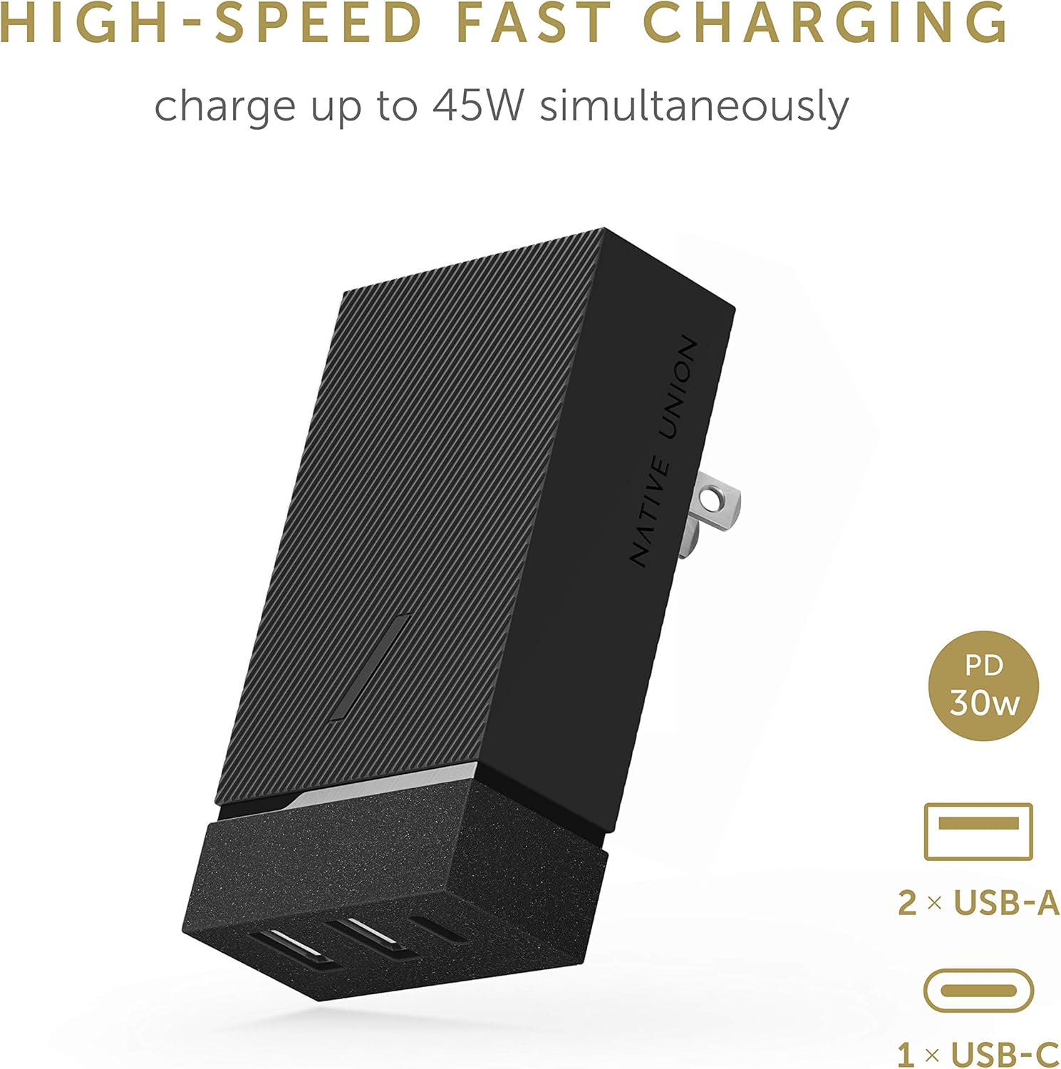 Native Union Smart Hub PD 45W – Power Delivery Enabled Fast-Charging 3-Port USB-A & USB-C Wall Charger – Compact Design with Dust-Repellent Silicone, Foldable Pins & Includes Travel Adapters (Slate)